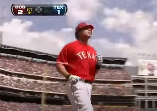 cruised in the top of the fourth as Cameron grounded out to second to start. Saltalamacchia flied out to deep center and Scutaro grounded back to the mound to end the inning. The Rangers fought back in the bottom of the fourth as Hamilton popped up to left to start. Beltre singled to left but Young flied out to right. Cruz sliced a single to right and Napoli cleared the bases with a 3 run bomb to Central America to give the Rangers the lead. Torrealba hit a squibber in front of the mound to end the inning with the Rangers ahead 5-4.